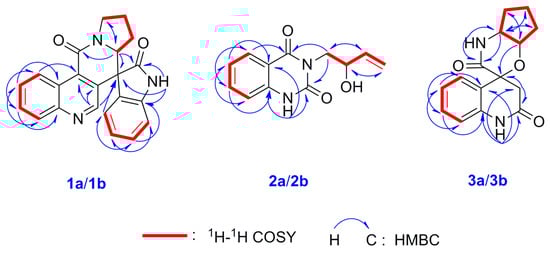 Key 1H-1H COSY and HMBC correlations of compounds 1a/1b–3a/3b.