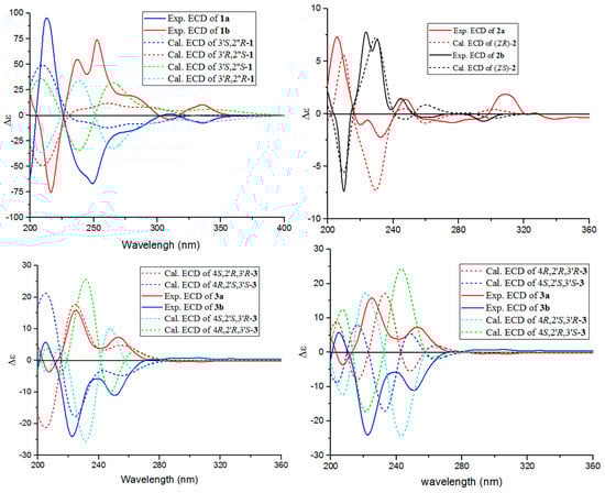 The conformers of compounds 1a/1b–3a/3b were obtained using the MM2 force field with ChemBio3D software. Gaussian 09 software was utilized for the semiempirical PM3 quantum mechanical geometry optimizations and the time-dependent density functional theory (TDDFT). ECD was calculated at the b3lyp/6-31g(d) level [20,21,22]. The ECD spectra conformers of 1a/1b–3a/3b were obtained using SpecDis 1.62 and were compared with the experimental data; the calculation details are listed in the supporting information (Figures S26–S33).
