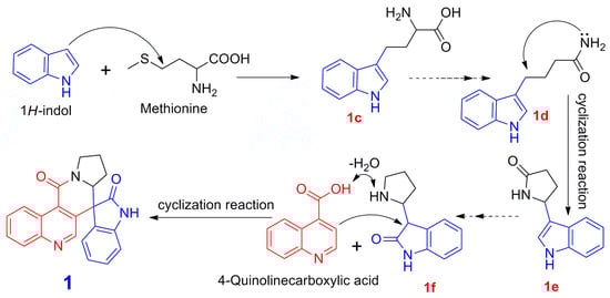 Isatisindigoticanine B (1) is the first example of a 1H-indol-2-one unit connected with a 4-quinolinecarboxylic acid unit and a pyrrolidine unit via a six-membered ring of C-3-C-4-C-9-N-1″-C-2″-C-3′. On the basis of its unique structural features, the putative biosynthetic pathways for isatisindigoticanine B (1) are proposed in Figure 4. The biosynthetic precursor of 1 is proposed from 1H-indol [4]. First, 1H-indol was connected with methionine moiety by sequential or simultaneous enzymatic catalysis to give 1c [4,5], and then 1c was modified via an enzyme-catalyzed reaction to give 1d [20]. Then, 1e was obtained by cyclization reaction of 1d [8] and then changed via a reduction reaction to give 1f, and finally 1f was modified by steps of dehydration and cyclization reactions [5,8] to give 1. Compound 1 was separated by chiral analysis to give 1a and 1b [2,3].