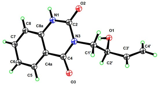 Isatisindigoticanine C (2) was obtained as a white amorphous power. Its molecular formula was assigned as C12H12N2O3 by the 1D NMR data and the HRESIMS quasimolecular ion peak at m/z 231.0771 [M − H]− (cacld. 231.0775 [M − H]−). The 1H NMR spectrum (Table 1) of 2 showed signals of an ortho-disubstituted benzene ring at δH 7.93 (1H, d, J = 8.0 Hz, H-5), 7.22 (1H, dd, J = 8.0, 7.7 Hz, H-6), 7.76 (1H, dd, J = 8.2, 7.7 Hz, H-7) and 7.16 (1H, d, J = 8.2 Hz, H-8) [8,9,15]; a monosubstituted double bond at δH 5.83 (1H, ddd, J = 16.9, 10.7, 6.5 Hz, H-3′), 5.01 (1H, dd, J = 10.7, 1.2 Hz, H-4′a) and 5.11 (1H, dd, J = 16.9, 1.2 Hz, H-4′b) and an exchangeable proton at δH 11.39 (brs, NH-1) [15]. Analysis of the 13C NMR, DEPT 135° and HSQC data (Table 1) of 2, a 2′-hydroxybut-3′-en-1′-yl (45.6, CH2; 69.2, CH; 140.0, CH; 115.5, CH2) [4,10] and a quinazoline-2,4(1H,3H)-dione moiety (150.8, C; 162.6, C; 114.3, C; 127.9, CH; 122.9, CH; 135.4, CH; 115.5, CH; 139.9, C) were observed [1,2,3]. HMBC correlations of H-1′/C-2 and C-4 indicated the 2′-hydroxybut-3′-en-1′-yl unit connected with the quinazoline-2,4(1H,3H)-dione unit via a N-3-C-1 bond [2,3]. This inference was supported by detailed analysis of the 2D NMR data including HSQC, HMBC (Figure 2) and 1H-1H COSY (Figure 2) experiments. The planar structure of 2 was thus deduced as depicted in Figure 1. Subsequent HPLC separation of 2 on a chiral column yielded 2a and 2b in a ratio of approximately 1:1, with opposite optical rotations (−31.1° for 2a and +33.1° for 2b) and cotton effects in their experimental ECD spectra (Figures S29 and S35, Supplementary Information). The comparison of the experimental CD spectra and the calculated ECD spectra of 2a and 2b (Figure 3) confirmed the two enantiomers as (−)-(2′R)-isatisindigoticanine C (2a, Figure 1) and (+)-(2′S)-isatisindigoticanine C (2b, Figure 1), respectively [2,3]. Finally, a single-crystal X-ray experiment with Cu Kα radiation analysis confirmed the structure of (+)-(2′S)-isatisindigoticanine C (2b, Figure 5).