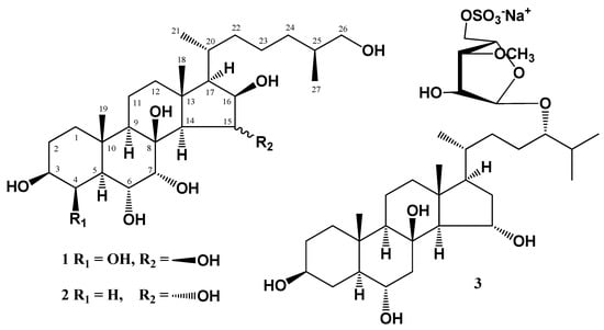 - Peng, Y.; Zheng, J.; Huang, R.; Wang, Y.; Xu, T.; Zhou, X.; Liu, Q.; Zeng, F.; Ju, H.; Yang, X.; et al. Polyhydroxy steroids and saponins from China sea starfish, Asterina pectinifera and their biological activities. Chem. Pharm. Bull. 2010, 58, 856–858. [Google Scholar] [CrossRef]