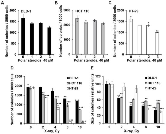 The effect of polar steroids from P. pectinifera (1–3) and X-ray radiation on colony formation in human colorectal carcinoma cells. DLD-1 (A), HCT 116 (B), and HT-29 (C) cells (2.4 × 104) with or without polar steroid 1–3 (40 µM) or (D,E) X-ray radiation (2–10 Gy) treatment were subcultured onto 0.3% Basal Medium Eagle (BME) agar containing 10% FBS, 2 mM L-glutamine, and 25 µg/mL gentamicin. After 14 days of incubation, the number (A–D) and size (E) of the colonies were evaluated under a microscope with the aid of the ImageJ software program. All experiments were repeated at least three times in each group (n = 9 for control or compounds treated cells or X-ray exposed cells, n—quantity of photos). Results are expressed as the mean ± standard deviation (SD). The asterisk (*) indicates a significant decrease in the number or size of the colonies of cancer cells treated by polar steroids or X-ray compared to PBS-treated cells (*p < 0.05, **p < 0.01, ***p < 0.001).