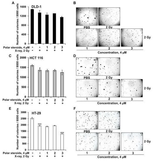 The radiosensitizing effects of polar steroids from P. pectinifera (1–3) on colony formation in human colorectal carcinoma cells. DLD-1 (A,B), HCT 116 (C,D), and HT-29 (E,F) cells (2.4 × 104) were either treated or not treated with a combination of polar steroids 1–3 (1, 2, 4 µM) and X-ray radiation (2 Gy) and subcultured onto 0.3% Basal Medium Eagle (BME) agar containing 10% FBS, 2 mM L-glutamine, and 25 µg/mL gentamicin. After 14 days of incubation, the number (A,C,E) and size (B,D,F) of the colonies was evaluated under a microscope with the aid of the ImageJ software program. All experiments were repeated at least three times in each group (n = 9 for control or compounds treated cells or X-ray exposed cells, n—quantity of photos). The magnification of representative photos is 10×. Results are expressed as the mean ± standard deviation (SD). The asterisk (*) indicates a significant decrease in the number or size of colonies of cancer cells treated with X-ray compared to PBS-treated cells or polar steroids in combination with X-ray compared to irradiated cells (*p < 0.05, ***p < 0.001).