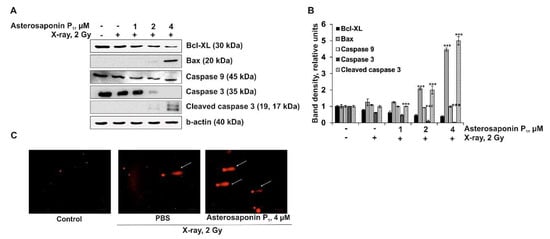 The effect of combinatorial treatment by asterosaponin P1 from P. pectinifera with radiation on apoptosis induction in HT-29 cells. (A) Regulation of the anti-apoptotic (Bcl-XL) and pro-apoptotic (Bax) proteins expression as well as the initiator (caspase 9) and effector (caspase 3, cleaved caspase 3) caspases, and b-actin by X-ray or with a combination of asterosaponin P1 and X-ray in HT-29 cells. (B) Relative bands density was measured using Image Lab™ Software 4.1. Quantitative results are presented as the mean values from three independent experiments. Significant differences were evaluated using the Student’s t-test. The asterisks (***p < 0.001) indicate a significant alteration of protein expression in cells treated by X-ray compared to PBS-treated cells, or asterosaponin P1 in combination with X-ray compared to irradiated cells. (C) HT-29 cells were either treated or not treated by X-ray (2 Gy) or with a combination of asterosaponin P1 (4 µM) and radiation (2 Gy). DNA comets were stained with ethidium bromide and visualized using a fluorescent microscope ZOE™ Fluorescent Cell Imager. Representative images (Scale bar = 100 µm).