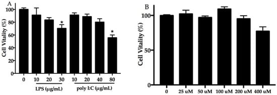 Effect of poly I:C, LPS, and docosahexaenoic acid (DHA) on cell viability. Normal human epidermal keratinocyte (NHEK) cells exposed to poly I:C (0–80 μg/mL) and LPS (0–30 μg/mL) (A), and DHA (B) for 24 h. Data are expressed as mean ± standard deviation (SD), n = 5. * Compared with blank control, p < 0.05. LPS, lipopolysaccharide; poly I:C, polyinosinic–polycytidylic acid.
