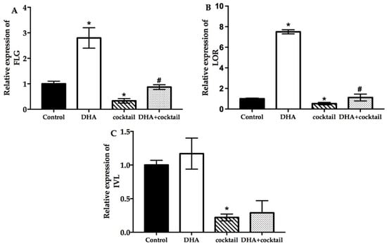 Effect of DHA on the differentiation of cultured NHEK cells with or without cocktail (20 μg/mL LPS plus 10 μg/mL poly I: C. Real-time quantitative polymerase chain reaction was used to evaluate the changes in FLG (A), LOR (B), and IVL (C) mRNA expression after incubation for 24 h. Data are presented as mean ± SD, n = 5. * Compared with a respective blank group, p < 0.05; # compared with their respective cocktail (20 μg/mL LPS plus 10 μg/mL poly I:C)-alone-treated group, p < 0.05. FLG, filaggrin; LOR, loricrin; IVL, involucrin.