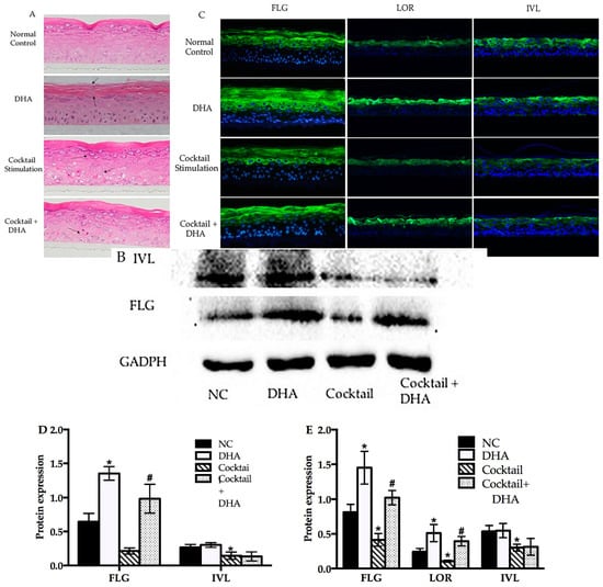 Topical treatment with DHA affected the morphology and differentiation protein expression in normal and inflammatory RHE models. (A) Morphology of normal, DHA cocktail-induced, and DHA-treated groups were evaluated using hematoxylin–eosin (HE) staining. (B) Western blot of FLG and IVL in normal control, DHA cocktail-induced, and DHA-treated groups. (C) Immunohistofluorescence analysis was executed for FLG, LOR, and IVL in the above RHE models. (D) Relative optical densities of FLG and IVL. (E) Relative fluorescence densities of FLG, IVL, and LOR. Magnification 10×, mean ± SD, n = 4–5. * Compared with the blank control groups, p < 0.05; # compared with the inflammatory group, p < 0.05. RHE, reconstructed human epidermis.