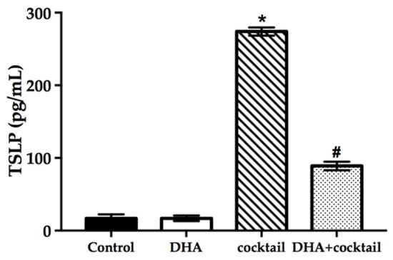 It was necessary to prove that the inflammatory RHE model has a reference value, so we measured the level of TSLP using ELISA, which is related to the inflammation characteristics observed in AD patients. As shown in Figure 5, supplementation with the cocktail significantly increased the secretion of TSLP compared with normal RHE models (16 pg/mL vs. 274 pg/mL, p < 0.05). Docosahexaenoic acid alone showed a slight effect on TSLP expression in normal RHE models. On the contrary, the topical treatment with DHA significantly decreased TSLP expression in inflammatory RHE models (90 pg/mL vs. 270 pg/mL, p < 0.05).