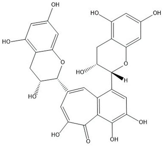 Black tea is not only a popular drink on a global scale, but also an antioxidant available in daily life [1]. The main component of black tea is theaflavin, which is formed by oxidative condensation of polyphenols and their derivatives, soluble in organic solvents such as ethanol [2]. Theaflavin plays a decisive role in the color, aroma and quality of black tea, and also has good medical and health care functions [3]. Besides behaving good free radical scavenging properties, theaflavins also have anti-oxidation, anti-mutagenic, hypolipidemic, anti-inflammatory, anti-tumor and anti-viral effects; therefore, it attracts high hot spot in medical research [4,5,6]. In addition, the four main monomers of theaflavins are theaflavin (TF), theaflavin-3-gallate (TF2A) and theaflavin-3′-gallate (TF2B), and theaflavin-3,3′-digallate (TF3) [7]. In this study, we will use the most commonly used ligand theaflavin (TF), from previous studies. The chemical structure is shown in Figure 1.