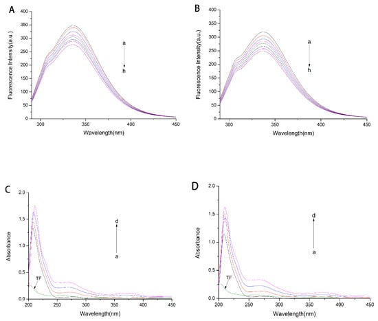 The effect of TF on the fluorescence spectra of HSA and GHSA were shown in Figure 2A,B. It could be seen that the maximum emission wavelength of HSA and GHSA was around 336 nm, while there was no emission peak for TF in this wavelength range. With the gradual addition of TF, the fluorescence intensity of HSA and GHSA showed different degrees of decline.
