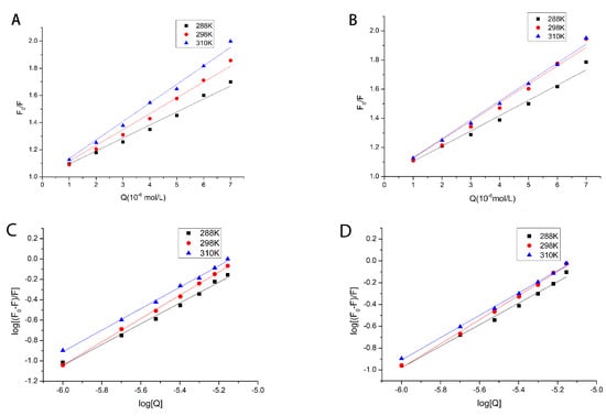The Stern–Volmer plots for the quenching of HSA by TF (A) and GHSA by TF (B) at different temperatures (288 K, 298 K, 310 K). Plots of log [(F0 − F)/F] versus log [Q] for the TF–HSA systems (C) and TF–GHSA systems (D) at different temperatures.