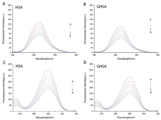 Ultraviolet spectroscopy is often used to determine the conformational changes of the protein itself [18].The ultraviolet absorption spectrum of the complex formed by TF and HSA/GHSA was measured, and the experimental results are shown in Figure 2C,D. It can be seen that both HSA and GHSA had two absorption peaks, which were around 205 nm and 280 nm, respectively. The absorption peak at 205 nm belongs to the skeletal peak of the protein itself, and the absorption peak at 280 nm is the absorption peak of the three fluorescent chromophores of tryptophan, tyrosine and phenylalanine in the protein [18]. As TF was gradually added to the HSA and GHSA solutions, the protein carbon skeleton and the chromophore absorption peak intensity increased. The maximum peak position of the carbon skeleton absorption peak was accompanied by a slight red shift.