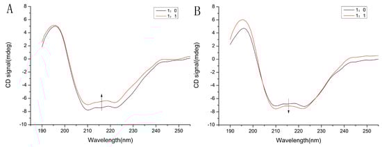 The circular dichroism can directly reflect changes in the conformational effects of the ligand on serum proteins [29]. Circular dichroic scanning spectra from 190 to 260 nm (far ultraviolet region) reflect the arrangement of protein peptide bonds and are used to calculate the ratio of protein secondary structures, namely α-helix, antiparallel, parallel, β-turn and random coil [29]. The results were shown in Figure 5A,B, and the corresponding conformational change data was shown in Table 3. Proteins have many chromophores that produce circular dichroism (CD) signals. It could be seen from Figure 5 that the α-helix exhibits strong negative absorption peaks at 208 nm and 222 nm. The addition of TF resulted in a decrease in the α-helix of HSA, while the random coil and the antiparallel, parallel and β-turn increased. In contrast, the addition of TF resulted in an increase in the α-helix of GHSA, while the random coil and the antiparallel, parallel and the β-turn showed a decreasing trend.