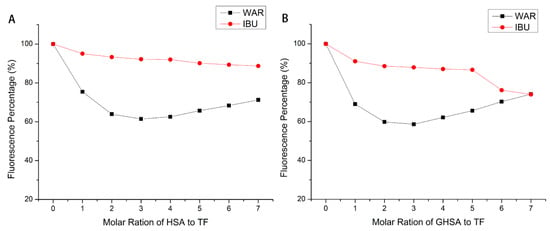 The binding position of TF on HSA/GHSA could be determined by site competition experiments. Studies showed that warfarin could specifically bind to serum protein at site I, while ibuprofen could specifically bind to site II [30,31,32,33]. Therefore, warfarin and ibuprofen were selected as probes for site competition, and fluorescence experiments were conducted to explore the binding mechanism [34]. By processing the fluorescence data, Figure 6 was obtained. It was seen that in the HSA/GHSA system in which TF was present; the change in fluorescence intensity caused by the addition of ibuprofen was much smaller than that of warfarin, and even tended to be unchanged. Thence, it could be confirmed that TF may share a binding site with ibuprofen.