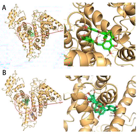 The binding mode of TF and HSA/GHSA was predicted by computer simulation of molecular docking techniques. The specific results of the combination were shown in Figure 7. The figure showed the combination of TF and HSA at the lowest binding energy, and the stability of the complex in this mode was stronger compared to the other modes. The same was true for the molecular docking results of TF and GHSA. As could be seen from the graph of Figure 7A, TF was bound to subdomain IIIA of site II of the HSA [35]. In the docked conformation enlargement, it could be seen that the amino acid residues surrounding the ligand binding site were PRO 468, CYS 477, THR 478, LYS 205, HIS 464 and GLU 465. Simultaneous to the predictions of the types of amino acid residues and the binding properties at the lowest binding energies, the software also predicted that the TF–HSA system had five hydrogen bond formations, including THR 478 (1 hydrogen bond), LYS 205 (3 hydrogen bond) and GLU 465 (1 hydrogen bond). We also found through the docking results of Figure 7B that the amino acid residues around the ligand binding site in the GHSA-TF system were VAL 469, VAL 462, PRO 468, SER 470, THR474, THR 478, LYS 205, LYS 477, CYS 461, GLU 465, and there were three hydrogen bonds at the amino acid binding site, including those involving VAL 469 (1 hydrogen bond) and THR 474 (2 hydrogen bonds).