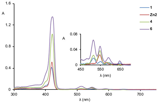 Absorption spectra of 1, Zn2, 4, and 6 in toluene. All compounds were used with a concentration of 1.0 μM. The inset shows an expansion of the Q bands.