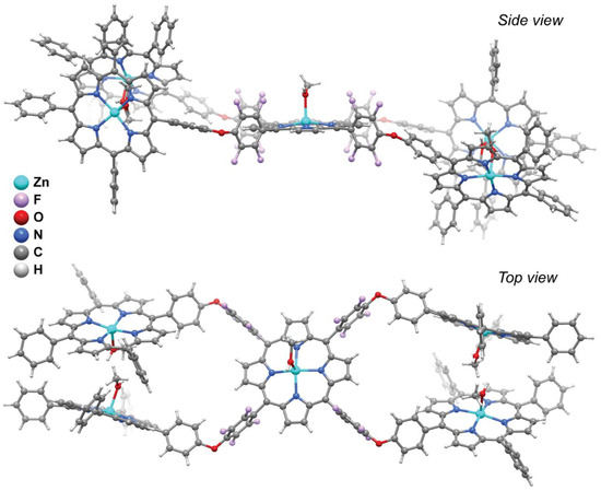 Pentaporphyrin Zn5 was isolated as large red single-crystals through recrystallization from a mixture of chloroform and methanol (among other solvents in minor quantity). Figure 3 depicts the centrosymmetric molecular unit present in the crystal structure of Zn5·Solvent (side and top views), clearly reflecting the high level of conformational flexibility of the large molecule. The three crystallographically independent Zn2+ metal centers exhibit identical coordination environments which strongly resemble a distorted square pyramid: while the basal plane is formed by the four nitrogen atoms arising from the porphyrinic core [Zn–N distances ranging from 2.040(3) to 2.089(4) Å (for the three environments)], the apical position is always occupied by a coordinated methanol molecule with the Zn–Omethanol distance being found in the 2.118(5)–2.197(5) Å range. As also depicted in Figure 3, the four peripheral porphyrin molecules adopt a conformation so they are close together, mutually interacting via weak supramolecular contacts most certainly also involving the solvent molecules of crystallization (not shown).