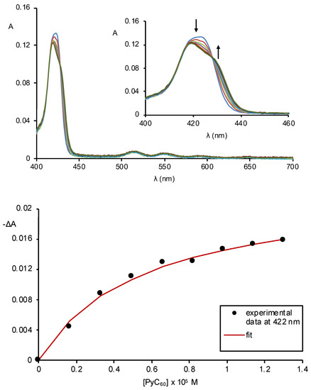 The binding constants (K) were assessed from the UV–Vis and fluorescence titrations. The variation of the absorbance at the Soret band caused by consecutive additions of PyC60 was used to determine the binding constants. The spectral changes at the Soret band were fit using non-linear least-squares procedures using the following equation for a 1:1 binding: