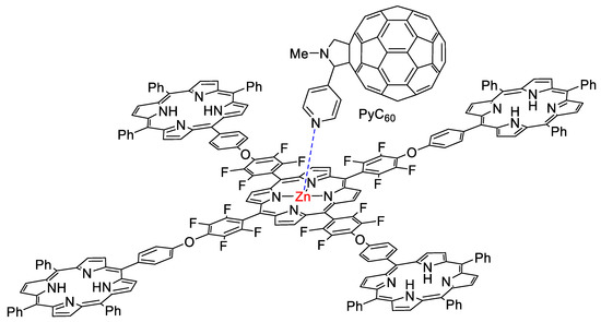 Fullerenes are another group of attractive building blocks, frequently used in association with porphyrins. In fact, architectures consisting of porphyrin derivatives (donors) and fullerenes (acceptors) are of particular interest, either as models for natural photosynthesis or for the conversion of light into electricity. Because of the unique three-dimensional structure of fullerenes, their low reduction potentials and small reorganization energy, providing the formation of long-lived charge separated states [47], porphyrin–fullerene photoactive systems have provided promising materials for photovoltaic applications [48,49,50,51,52,53,54]. In many cases, the photoactive system is a supramolecular complex formed by a multiporphyrin receptor and a fullerene guest [55,56,57,58,59,60,61,62,63]. Combining π–π interactions with hydrogen bonding [64] or axial coordination [65] is another strategy that results in the assembly of stable and robust architectures.