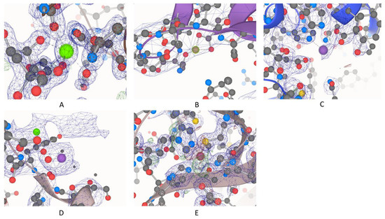 We started with a list of 141,616 usable PDB entries, and 53,146 of them contained at least one metal ion, including both biological and non-specific metal ions. The total was about 38%, which agrees with other studies and predictions [1,2]. In this study, we considered four major criteria in filtering “high-quality” metal ions, usable for downstream structural and dynamic analyses: resolution, occupancy, presence of symmetry atoms, and significant discrepancies in terms of numbers of electrons. Figure 1 shows both high- and low-quality examples based on these four criteria, as illustrated in an overlay of the electron density map over the structural model.