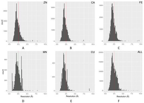 Distribution and 2.5 Å cutoff of structure resolutions: (A) Zn; (B) Ca; (C) Fe; (D) Mn; (E) Cu; (F) all metal ions.