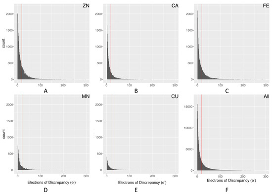 Distribution of electron discrepancy within 3.5 Å of the metal ion: (A) Zn; (B) Ca; (C) Fe; (D) Mn; (E) Cu; (F) all metal ions. The red line represents a standard deviation cutoff of 1, calculated from the distribution in graph F with outliers removed.