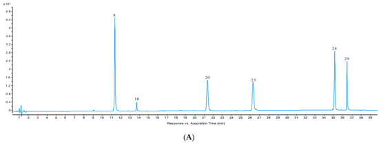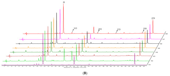 Other notable changes: β-Sitosterol was also a newly generated peak found only in shade-dried samples. Compounds 28 and 29 are a pair of isomers that can interconvert during drying. In shade-dried samples, the content of compound 28 increased 8-fold, while that of compound 29 decreased significantly.