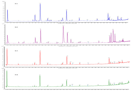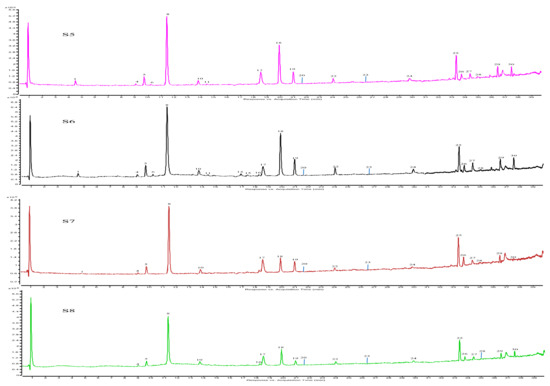 TIC chromatograms monitored in negative ion model fresh sample (S1) and shade drying (S2), Microwave drying(S3), Freeze drying (S4), Sunlight drying (S5), hot air drying(S6), Vacuum drying(S7), Far infrared ray drying (S8).