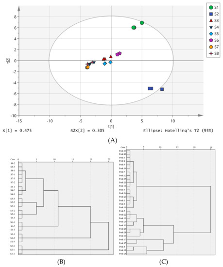 Multivariate statistical analysis of fresh sample and seven processed samples. (A and B) The PCA score plot and HCA plot of the LC-MS data set; (C) HCA plot of the LC-MS data based on chemical constituents. The compounds were identified either by MS2 spectra* or by authentic standards#. (S1–1~S1–3: Fresh sample, S2–1~S2–3: Shade drying, S3–1~S3–3: Microwave drying, S4–1~S4–3: Freeze drying, S5–1~S5–3: Sunlight drying, S6–1~S6–3: Oven drying, S7–1~S7–3: Vacuum drying, S8–1~S8–3: Far infrared ray drying) and different chemical constituents (peak 1–peak30).