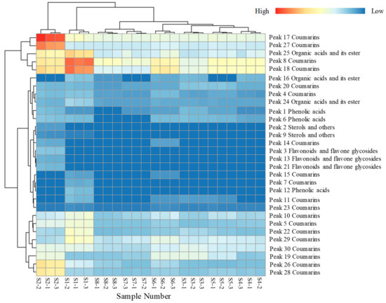 The HCA of the peak area indicated that all the compounds were clustered in five categories. The distance in the category including compounds 18, 8, 25, 17, and 27 was greater than that of the others, indicating the greatest variation in all chemical constituents (Figure 3C). A heat map of the separation of the compounds attributed was made to illustrate the relative variations in the eight processed groups (Figure 4). In the heat map, each colored cell indicates a concentration, with colors ranging from red to blue representing relative intensities varying from high to low, respectively. The 30 chemical components were classified into five clusters: phenolic acids, organic acids and their esters, flavonoids and flavone glycosides, coumarin, sterols and others. The heat map shows the changes in the relative chemical compositions for each type, showing the differences that could be related to the different drying processes. To illustrate the conspicuous changes in compound concentrations in these five chemical categories, detailed descriptions for each type are made below.