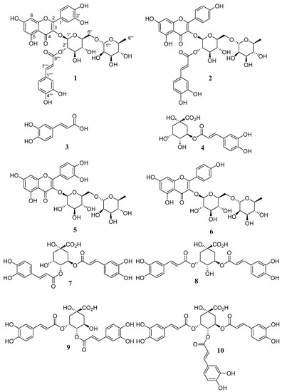 Flavonoids and chlorogenic acid derivatives are components known for their antiradical activity [30]. Thus, the isolated compounds (1–10) were tested for their antiradical activity using a DPPH assay. Compounds 1 and 2 exhibited a high activity compared to Trolox (Table 2). These components had higher antiradical activity than their respective non-acylated flavonoids. All chlorogenic acids were more active than Trolox as observed previously in the literature [31]. Additionally, the chlorogenic acid derivatives substituted by caffeoyl groups at the C-4 position showed antiradical activity compatible with the new acylated flavonoids.