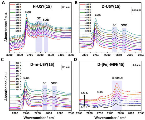 Varying temperature infrared spectroscopic (VTIR) spectra for H/D exchange for (A) O-H stretching region of H-USY(15), (B) O-D stretching region for D-USY(15), (C) D-m-USY(15), and (D) D-[Fe]-ZSM-5(45). To determine peak positions and to integrate relative signal intensities, a second derivative baseline was used. Absolute integrated areas were used in the following data treatment.