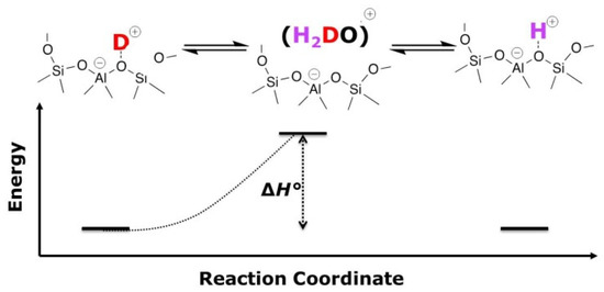 The derivation of the VTIR equation used in this study is inspired by E. Garrone and C.O. Arean [14,29], but does not use the van’t Hoff equation because the aim is not the characterization of adsorption processes. Instead, as it is represented in Figure 2, we consider the elementary steps in our system. The process of an H/D exchange is considered as a sequence of two reactions. With this assumption, and also based on the fact that at sufficiently high temperatures, i.e., the herein studied temperature ranges, protons of all acidic OH groups must be in rapid exchange, we now only consider the first half reaction herein. In short, the disappearing signal intensity of the O-D stretching band is monitored.