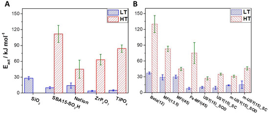 Apparent activation energies for proton transfer with experimental errors plotted for different materials. Values for low-temperature ranges are in blue (348–423 K), and values for elevated temperatures (423–523 K) are in red. (A) Data for classical proton-conducting materials and (B) data for different zeolites. Several silicon rich zeolites exhibit similar or even lower activation energies for proton transfer as TMPs which are commonly used for high-temperature PEM fuel cells.
