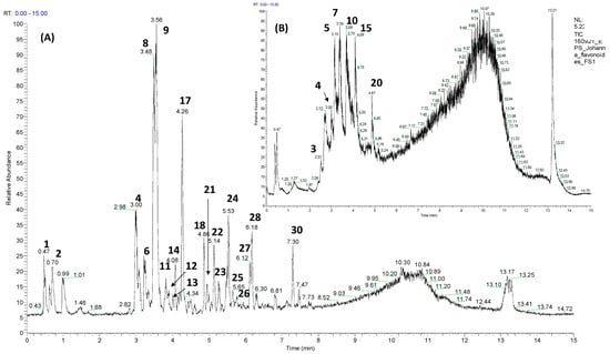 UPLC-TIC (ultra HPLC total ion current) chromatograms of (A) the phenolic-rich seed extract (PSE), and (B) F3S fraction. Peak numbers refer to those indicated in Table 2.