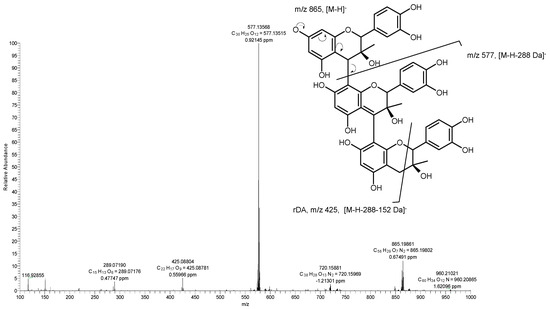 The fractionation of PSE and PPE extracts by Sephadex LH-20 allowed to obtain the compounds with high molecular weights, such as condensed flavonoids (proantocyanidins), in fractions F2 and F3. In the seeds, four procyanidin dimer isomeric compounds, type B (5, 8, 11, and 20) were detected, with pseudomolecular ions at m/z 577 [M − H]−, together the fragment ions at m/z 425, 407, 289, and 245. In each case, the fragment at m/z 425 [M-152-H]− corresponds to a retro-Diels–Alder (rDA) fission of the heterocyclic rings of the procyanidins dimers; the fragment ion at m/z 407 is generated by a Diels–Alder fractionation in the C ring, with a subsequent elimination of a water molecule; the fragment at m/z 289 [M – 288 − H]− is originated as a consequence of a methyl-quinone break of the interflavan bond, with the loss of an epicatechin molecule [26,27] and the subsequent elimination of CO2, generates the fragment ion at m/z 245 [15,28,29]. In the peel only two type B dimers were detected (compounds 5 and 11). Due to the lack of standards, it was not able to establish the precise type of dimer (B1–B4).