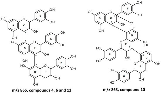 The type B dimeric procyanidins display C4–C8 or C4–C6 bonds, while those of type A show additional ether bonds between C2–O–C5 or C2–O–C7 [30,31]. Therefore, type A dimeric procyanidins (such as compound 3, m/z 575) have a lower number of hydrogen atoms in their structure with respect to type B ones. Dimeric procyanidins have already been identified in seeds and/or peels of Hass variety [6,15,24,27,28]. Kosinka et al. [15] reported the presence of two type B procyanidin dimers (m/z 577) and another type A (m/z 575) in peels of the Hass variety.