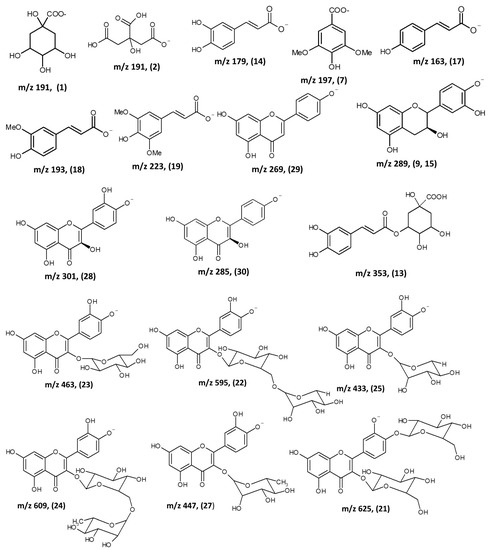 The presence of polyphenolic compounds was verified based on the following parameters: (i) the characteristic absorbance (λmax), (ii) the measurement of the exact mass of the pseudomolecular ion [M − H]− (which was compared to a database of standard polyphenols from previous studies, finding an observed mass error <10 ppm with respect to the theoretical mass), and (iii) the information previously published in the literature (Table 2).
