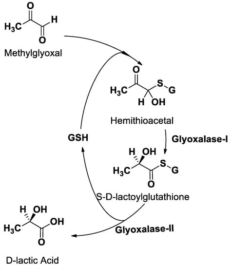 - Thornalley, P.J. The glyoxalase system: new developments towards functional characterization of a metabolic pathway fundamental to biological life. Biochem. J. 1990, 269, 1–11. [Google Scholar] [CrossRef] [PubMed]