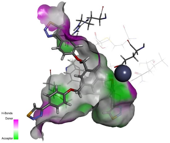 A series of twelve heterocyclic compounds containing multi-armed 1,2,3-selenadiazole and 1,2,3-thiadiazole benzene derivatives were tested against the Glo-I enzyme as described in the methods section, and the results obtained are presented in Table 1. All tested compounds showed appropriate activity with low IC50 values. In general, compounds containing di and tri methylene phenoxy spacers (5–8, IC50 = 3.0–23.6) showed higher activity than those counterparts without a methylene phenoxy spacer (1–4, IC50 = 32–64), which indicates the importance of the linker to generate a better fitting inside the active site. This fitting is mainly attributed to better flexibility of the compounds by filling the pockets optimally. Adding to this is the presence of an oxygen atom, which introduces a coordinate bond with the zinc atom within the active site. The oxygen atom is performing zinc chelation, which is normally accounted to be the major contributor of activity in Glo-I (Figure 2). Compounds containing 1,2,3-thiadiazole ring (2, 8, 10, and 12) showed lower IC50 values (better activity) compared to their 1,2,3-selenadiazole analogues (1, 7, 9, and 11). The opposite was observed in the case of compounds (3 and 5) such that those containing selenium hetero atoms gave higher IC50 values (lower activity) compared with those containing sulfur hetero atoms with the same number of arms (4 and 6). Based on these findings, an argument could be deduced that sulfur or selenium atoms are not crucial determinants for activity against the Glo-I enzyme when the compounds have lower molecular weight, and both are expected to perform weak hydrogen bond acceptor properties. The most active compound was found to be the tetra-armed 1,2,3-thiadiazole derivative (10), which has four sulfur hetero atoms and was found to be eight times more active than its selenium containing counterpart. This could be attributed to the importance of the size of the selenium atom when the active site is fully occupied by the tetra-armed moiety. Interestingly, this trend was repeated in the hexa-armed inhibitors where the sulfur analogue is approximately three times more active than the selenium analogue.