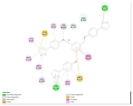 For many decades, the glyoxalase system (particularly Glo-I) attracted the attention of researchers as a promising anticancer target [,]. For example, More et al. [,,] proposed the first glutathione based Glo-I inhibitors. Natural products, on the other hand, such as coumarins [], flavonoids [], and anthocyanidins [] have shown noticeable Glo-I inhibitory activity. Recently, we used in silico modeling to investigate the active site of the Glo-I enzyme and revealed that three main parts exist inside its active site; a highly polarized mouth, a zinc atom, and a deeply hydrophobic pocket. These particular features were useful when it came to searching for a commercially available AldrichCPR database ketol group [] and also for designing a novel inhibitor of Glo-I enzyme possessing a thiazolecarboxylic acid moiety [,]. In the current study, molecular docking, using the LibDock protocol within discovery studio (DS 2017), of a series of multi-arm 1,2,3-selenadiazole and 1,2,3-thiadiazole benzene derivatives was carried out. The tested compounds were then assayed in vitro against the Glo-I enzyme, and Pearson product-moment correlation was done between in silico and in vitro results.