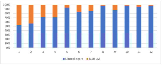 Column chart representation of the correlation between the LibDock score and the in vitro IC50 values as reported in Table 1.