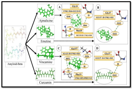 There is corpus evidence of AD being linked with oligomerization of β-Amyloid peptides [20]. Thereby, one of the procedures to adapt to AD is to discover compounds that can promote Aβ anti-aggregation and clearance [21]. The natural products or extracts reported in various preclinical and certain clinical studies provide valuable input to AD therapy [22,23]. Among them, curcumin is shown to inhibit Aβ aggregation and act as an antidote to Aβ-induced toxicity [14]. In the present investigation, Aβ was found to associate with Vnc through the amino acids Phe19, Phe20, Ala21, Asp23, Ile32, Gly33, Leu34, Met35 and Val36 (Figure 1C, Table 1); with Ajm through the amino acid residues Phe19, Phe20, Ala21, Gly22, Asp23, Ile32, Gly33,Leu34, Met35,and Val36 (Figure 1A, Table 1); and with Eme through the amino acid residues Ala21, Gl22, Asp23, Gly33, Leu34, Met35 and Val36 (Figure 1B, Table 1); as compared to standard curcumin, which was found to associate through the amino acid residues Ala21, Glu22, Asp23, Val24, Gly25, Leu34, Met35, Val36 and Gly37 (Figure 1D, Table 1). The amino acid residues Ala21, Asp23, Met35, and Val36 were seen in common interaction with selected ligand as well as curcumin in Aβ.