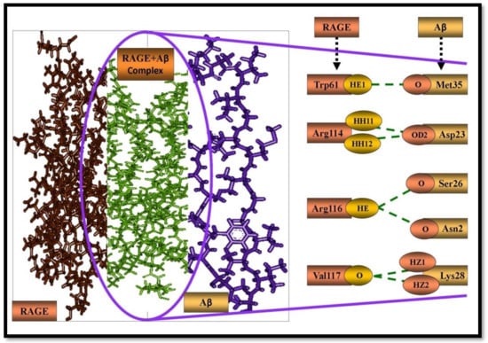 In the complex of Aβ and RAGE, seven H-bonds were found in which Met35 interacts with Trp61. Two amino acid residues of Asp23 were found to interact with Arg114, Ser26 interacted with Arg116, Asn27 interacted with Arg116, and two amino acid residues of Lys28 interacted with two amino acid residues of Val117 (Table 3).
