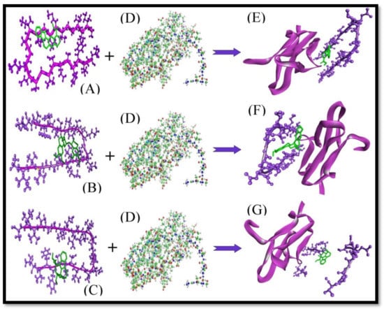 The complex-protein interaction. (A) The complex of Aβ+Ajm, (B) the complex of Aβ+Eme, (C) the complex of Aβ+Vnc. (D) Structure of RAGE protein. (E) The interacting complex structure of (Aβ+Ajm) with RAGE obtained by the protein-protein docking method. (F) The interacting complex structure of (Aβ+Eme) with RAGE obtained by the protein-protein docking method. (G) The interacting complex structure of (Aβ+Vnc) with RAGE obtained by the protein-protein docking method.