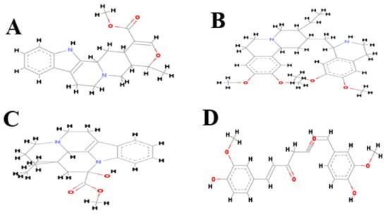 2D chemical structure of the compounds: (A) ajmalicine, (B) emetine, (C) vincamine, (D) curcumin.