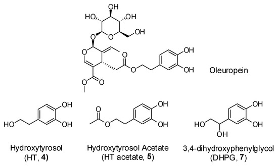 Polyphenols are a wide family of compounds found in plant-based foods, such as cranberries, grapes, olives, and walnuts, and have many diverse biological activities. One of the most important components of the polyphenol family is hydroxytyrosol (HT), a simple o-diphenol found in leaves and fruits of olive tree, virgin olive oil, as well as its wastewaters. It is derived from the hydrolysis of oleuropein, during the maturation of olives, storage of oil, and preparation of table olives. Two other important polyphenols of olive tree are hydroxytyrosol acetate and 3,4-dihydroxyphenylglycol (DHPG) (Figure 1).
