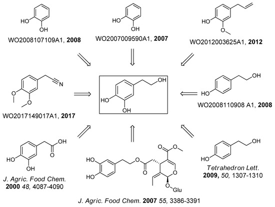 Due to the described problems, there has been a growing interest in developing an efficient synthetic route in order to obtain pure HT, but the synthesis is problematic since this compound is relatively soluble in water and polar organic solvents, therefore, the complete isolation through extraction from the reaction media is difficult [52]. Furthermore, HT is easily oxidized and relatively unstable during silica gel purifications and long-term storage [52]; thus adequate precautions must be taken (acid pH and absence of oxidants are crucial), concerning the synthesis and purification. Numerous synthetic approaches (more than 85 references in Reaxys database and 18 patents) [46,47,48,50,51,52,53,54,55,56,57,58,59,60,61,62,63,64,65,66,67,68,69] for the synthesis of HT have been described; however all these methods appear to have many disadvantages, i.e., low yields, laborious purifications, high cost, and many byproducts (Figure 2). The starting material for most of these synthetic procedures is tyrosol, through an oxidative procedure [51,57,58,59,62,64,69], though, the major disadvantage of the abovementioned approaches consists mainly of the use of non-eco-friendly oxidative reactants and the relatively high price of tyrosol. Alternatively, the synthesis of HT has been presented by the reduction of 3,4-dihydroxyphenylacetic acid but the commercial price of the acid (or the price of the corresponding nitrile) is too high [48,52,60,66]. Additionally, the isolation of HT from the reaction media is difficult (because of the water solubility), thus the overall yield is often low. Interestingly, only three synthetic approaches use catechol as starting material, even though this molecule is 6400-fold cheaper than tyrosol (Sigma-Aldrich 2019) (Table 1).