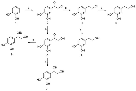 - Tuck, K.L.; Tan, H.-W.; Hayball, P.J. Synthesis of Tritium-Labeled Hydroxytyrosol, a Phenolic Compound Found in Olive Oil. J. Agric. Food Chem. 2000, 48, 4087–4090. [Google Scholar] [CrossRef] [PubMed]