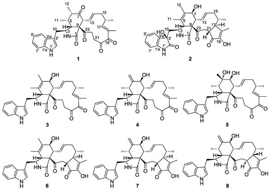 Six known cytochalasan alkaloids were identified as chaetoglobosin G (3) [24,25], isochaetoglobosin D (4) [23], armochaetoglobin U (5) [26], chaetoglobosin Vb (6) [22], cytoglobosin A (7) [23], and cytoglobosin Ab (8) [27] by comparing their NMR and HR-ESI-MS data with those in the scientific literature.